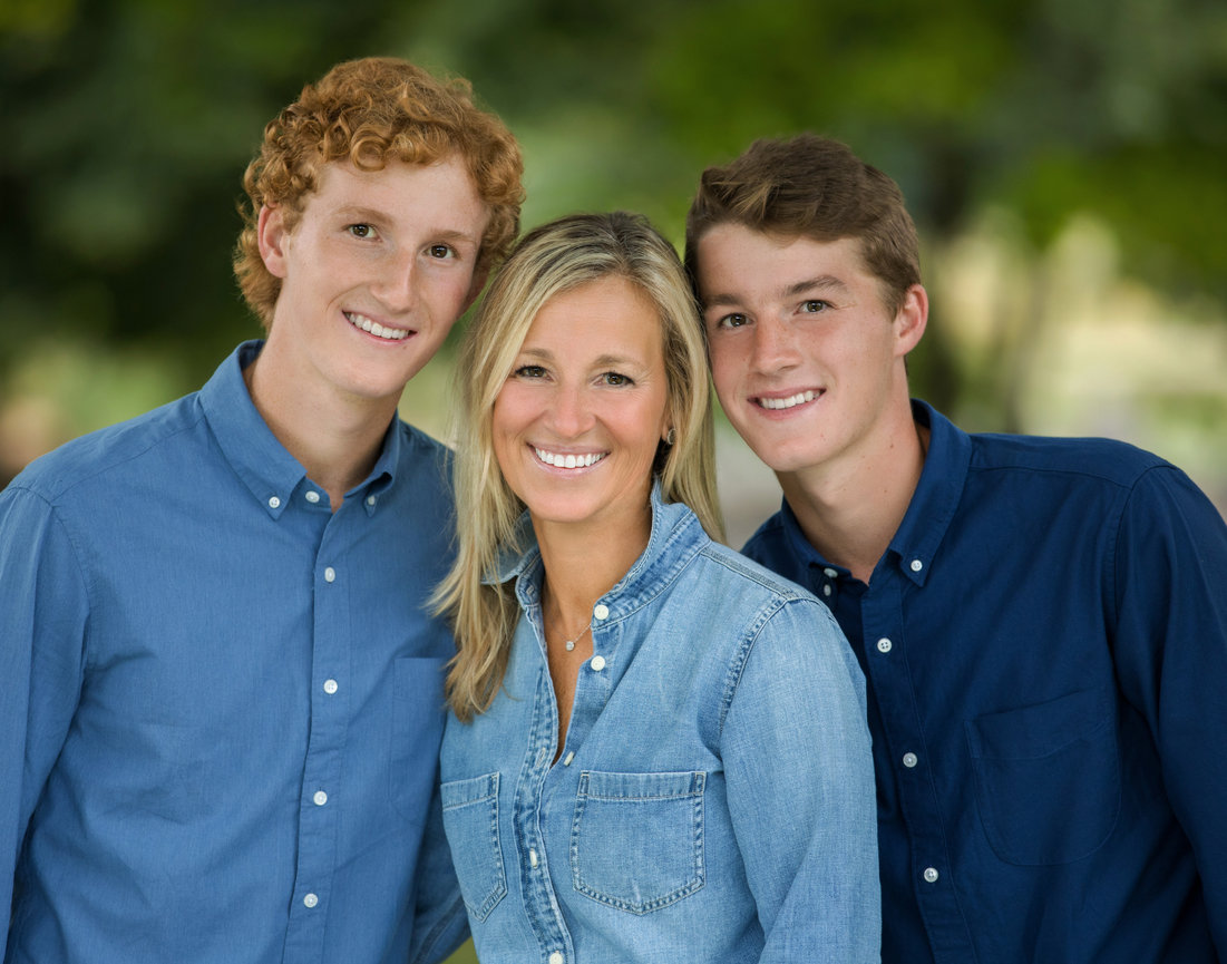 outdoor family portrait of mom with twin high school senior boys in park Mansfield ma