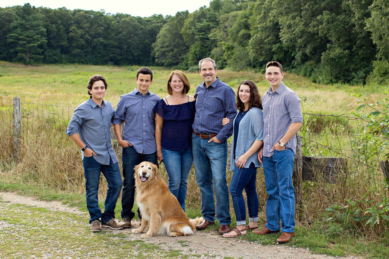 outdoor family portrait in blue of three teenaged children and mother and father and family dog by stone wall and garden canton ma