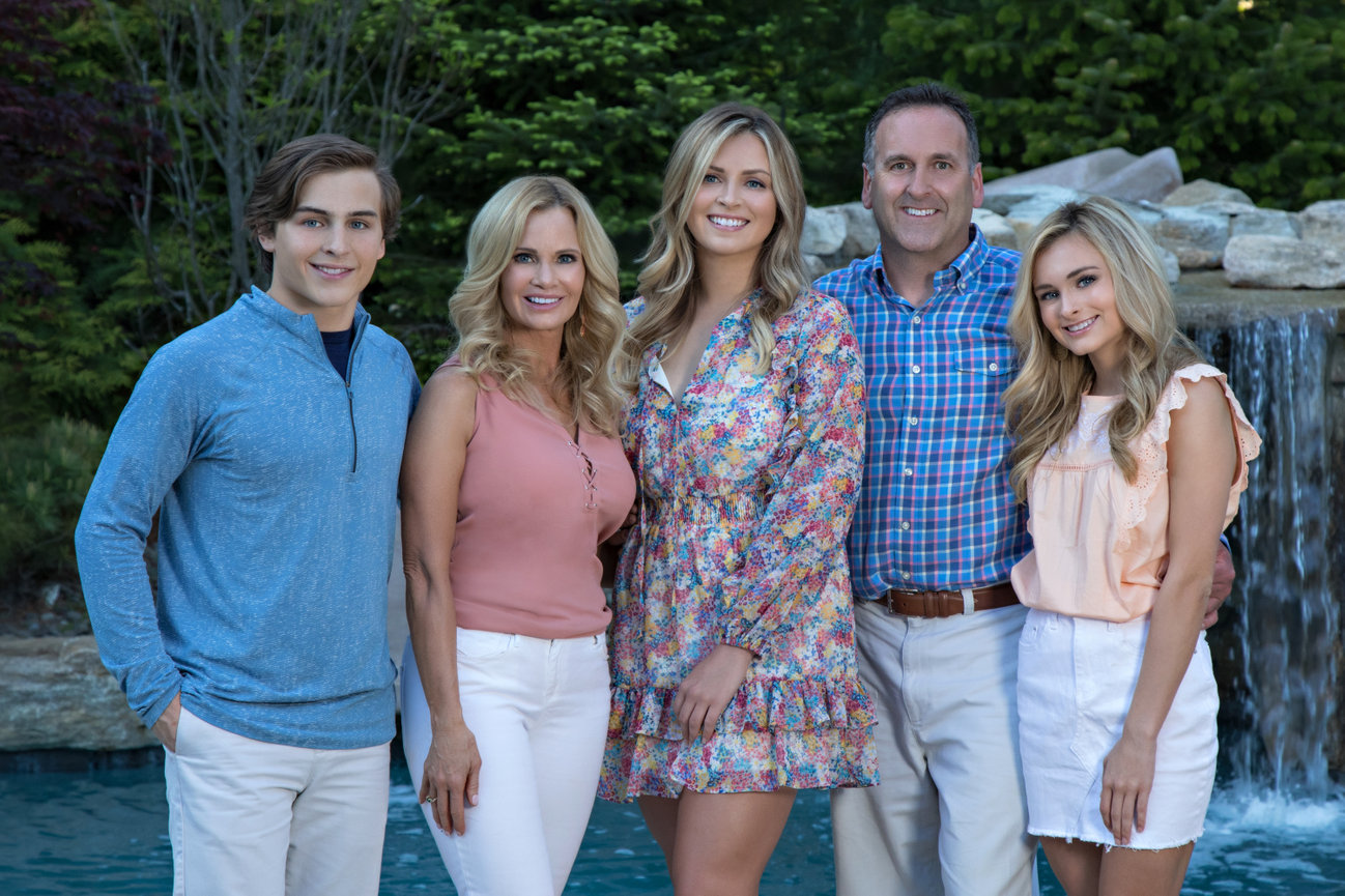 outdoor mother and high school senior girl during summer portrait by family pool with waterfall sharon ma