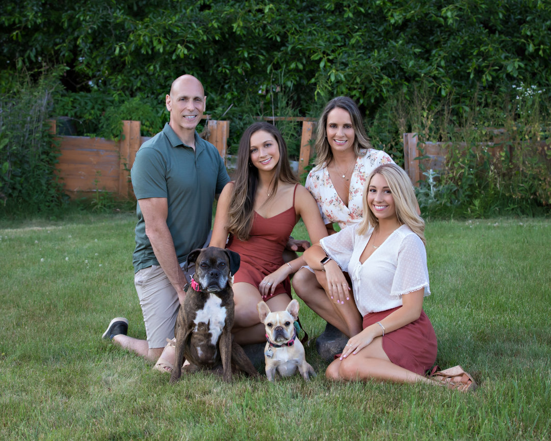 outdoor family portrait of parents and young adult daughters with boxer dog and French bulldog by stone wall and garden walpole ma